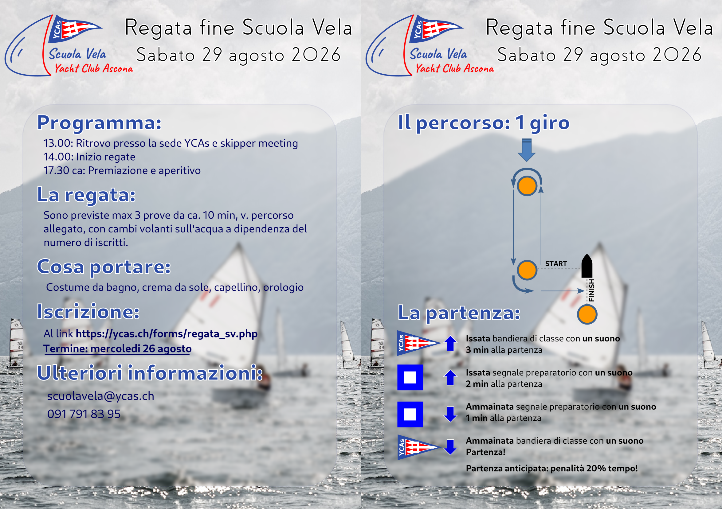 I partecipanti ai corsi di vela YCAs concedono pieno diritto e permesso al circolo organizzatore (YCAs) di pubblicare e/o trasmettere tramite qualsiasi mezzo, fotografie o riprese di persone o barche durante il corso, inclusi ma non limitati a spot pubblicitari televisivi, canali multimediali sulla rete di internet, e altri canali che possono essere usati per scopi editoriali/pubblicitari.